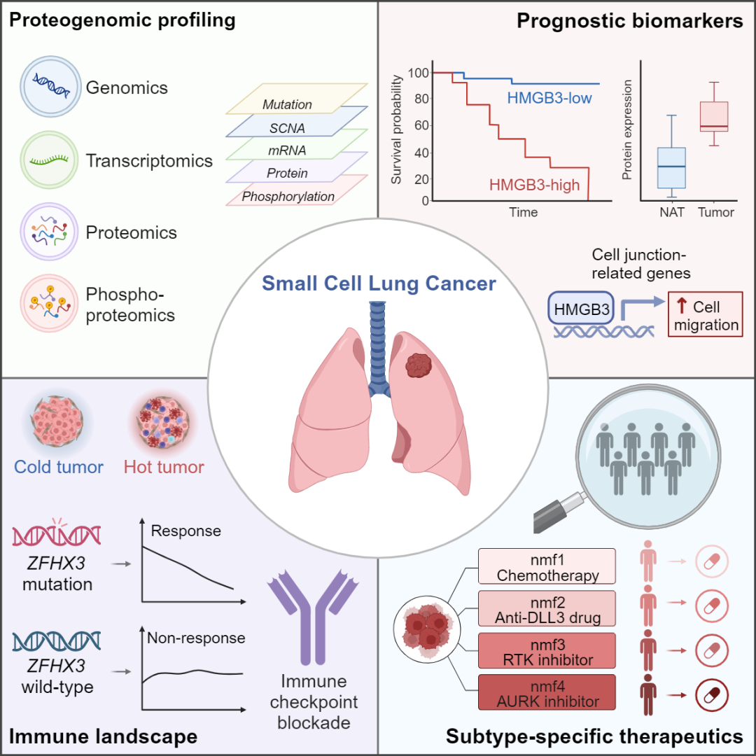 該研究對112例小細胞肺癌患者的腫瘤組織和配對癌旁組織樣本進行了蛋白質基因組學分析。通過整合基因組、轉錄組、蛋白質組、磷酸化蛋白質組等多維組學數據,團隊系統揭示了小細胞肺癌的分子特徵,為小細胞肺癌的發生發展機制、預後監測、分子分型和個性化治療策略提供了新思路。
