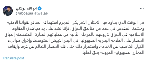 對此,“真主黨旅”領導人阿布·阿拉·瓦萊(Abu Ala al-Walai)迅速發佈回應,呼籲伊拉克抵抗運動開始“第二階段神聖行動”。在聲明中,他譴責了美軍對該組織所屬機構發動的襲擊,呼籲抵抗組織進一步實施包括封鎖以色列地中海航線、打擊以色列港口在內的行動。他還強調該組織對美方的打擊將持續進行,直至以色列停止在加沙地帶的軍事行動並解除對加沙地帶的封鎖。