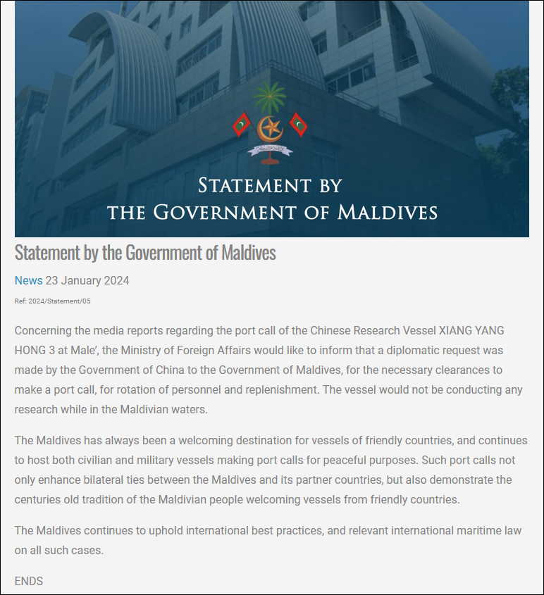 馬爾達夫外交部還説,馬爾代夫“一直歡迎友好國家的船隻停靠,並繼續接待出於和平目的停靠其港口的民用和軍用船隻”,這不僅加強了馬爾代夫與其夥伴國之間的雙邊關係,而且也展示了馬人民歡迎友好國家船隻的百年傳統。聲明表示,該國“將繼續在所有此類情況下堅持國際最佳做法並維護相關國際海事法”。