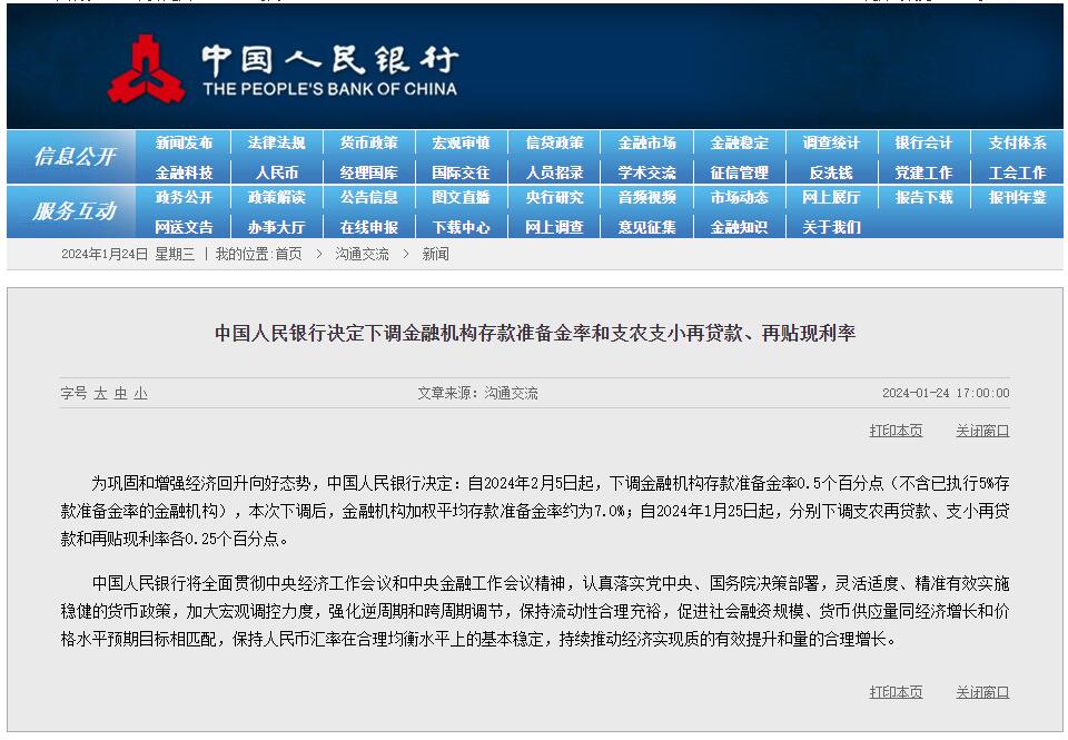 據央行網站24日消息,為鞏固和增強經濟回升向好態勢,中國人民銀行決定:自2024年2月5日起,下調金融機構存款準備金率0.5個百分點(不含已執行5%存款準備金率的金融機構),本次下調後,金融機構加權平均存款準備金率約為7.0%;自2024年1月25日起,分別下調支農再貸款、支小再貸款和再貼現利率各0.25個百分點。