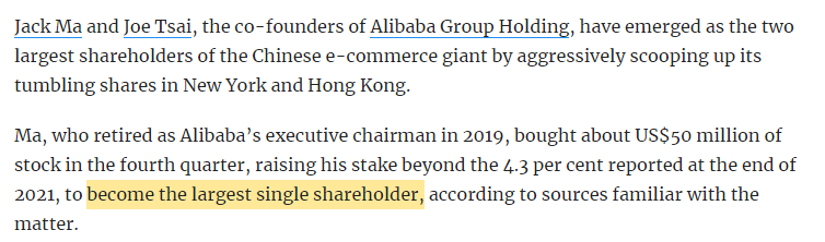 據香港《南華早報》1月24日消息,“知情人士”表示,隨着馬雲在第四季度購買了價值約5000萬美元的股票,他對阿里的持股比例超過了2021年底的4.3%,成為阿里巴巴最大的單一股東;第二大股東是阿里巴巴現任董事長蔡崇信。近期,他通過其家族投資平台增持了1.5億美元的阿里股票,而根據去年年報,他當時的持股比例為1.4%。