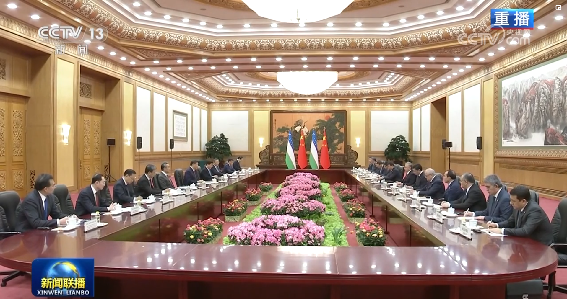 歡迎儀式後,習近平主席同米爾濟約耶夫總統舉行會談。兩國元首宣佈,中烏決定發展新時代全天候全面戰略伙伴關係,在更高起點上推動構建中烏命運共同體。