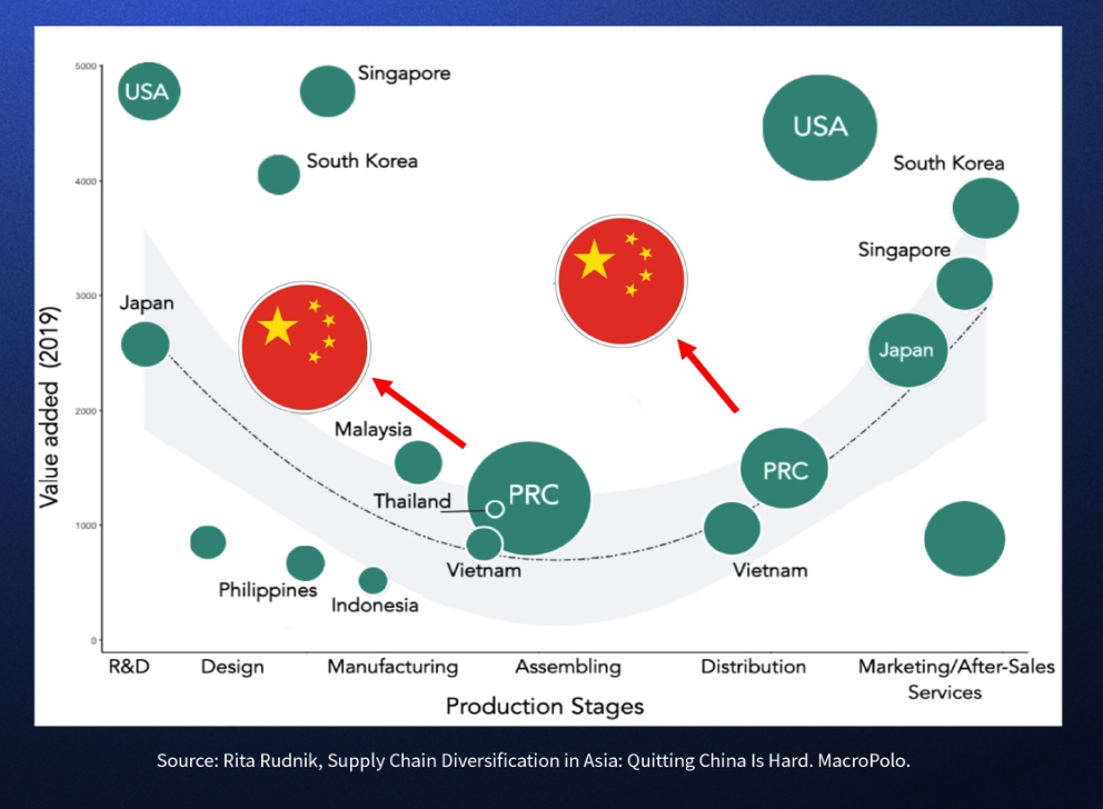 宏碁集團創辦人施振榮先生提出了著名的Smile Curve微笑曲線。10年、20年前我們跟越南差不多大,很小的一個球,現在變得跟美國差不多大,但是這個球在微笑曲線的地位沒怎麼改變,仍舊在中間偏下,這説明我們的附加值比較低。我們要做的就是把這個球往左上方推,把附加值往上推。