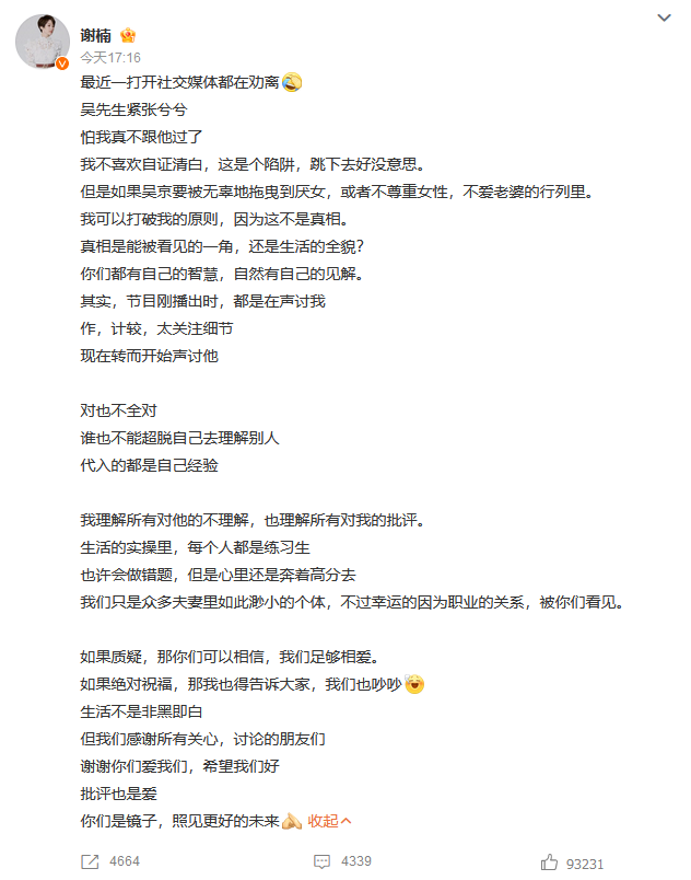 1月25日,主持人謝楠在微博髮長文回應近日針對吳京的爭議:“我不喜歡自證清白,這是個陷阱,跳下去好沒意思。但是如果吳京要被無辜地拖曳到厭女,或者不尊重女性,不愛老婆的行列裏。我可以打破我的原則,因為這不是真相。”