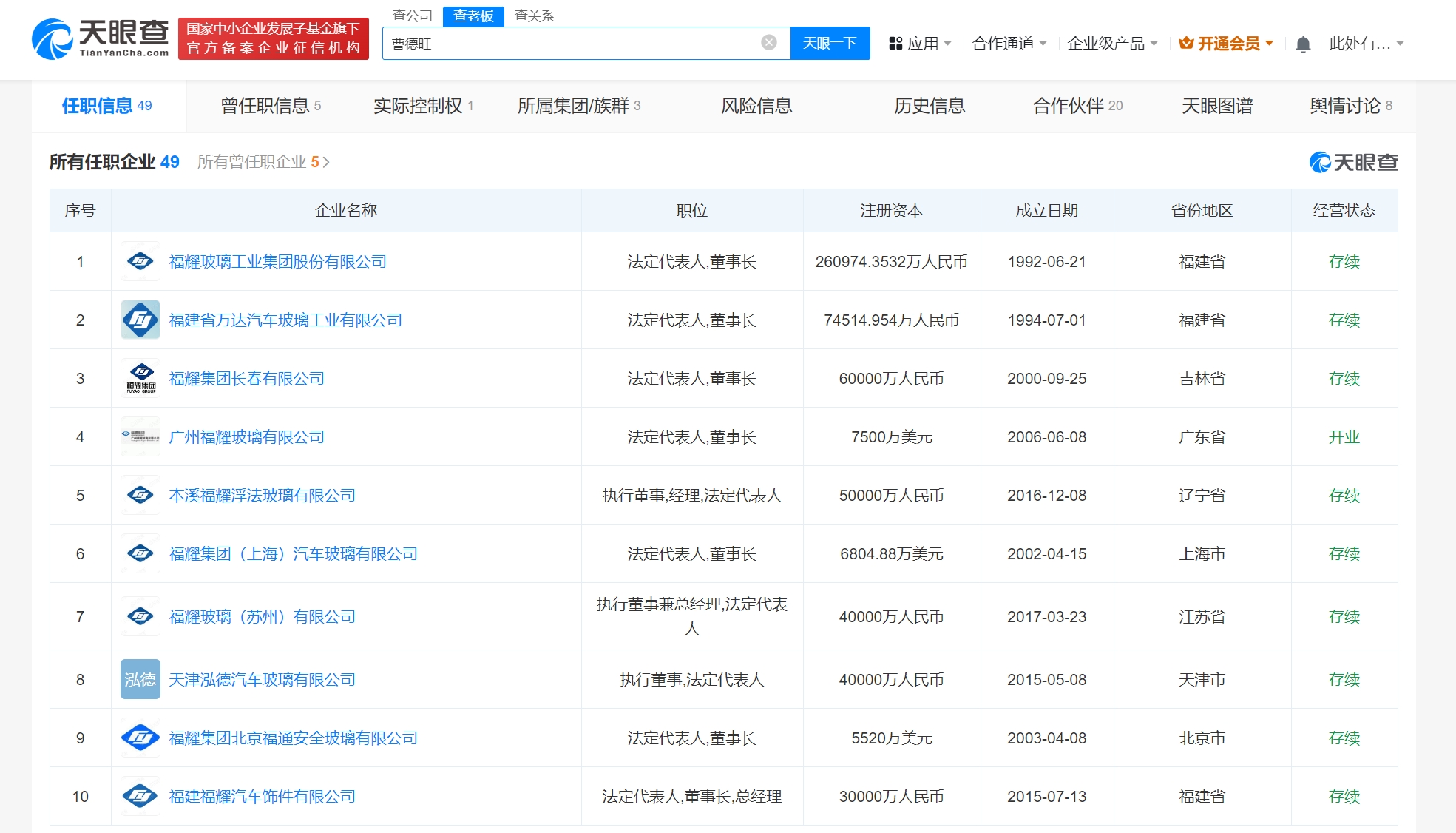 天眼查App顯示,曹德旺共關聯49家企業或社會組織,其中37家為存續狀態,包括福耀玻璃(600660)、福建省萬達汽車玻璃工業有限公司、福耀集團北京福通安全玻璃有限公司、福耀汽車鋁件(福建)有限公司等。上述企業或社會組織中,多數為福耀在各地的玻璃、模具、汽車飾件、汽車鋁件等公司,此外還包括曹德旺捐贈創立的河仁慈善基金會,以及曹德旺創辦的科研機構福州市福耀高等研究院。值得一提的是,福州市福耀高等研究院正籌建福耀科技大學(暫名),該大學也由曹德旺發起、河仁慈善基金會捐資創辦。