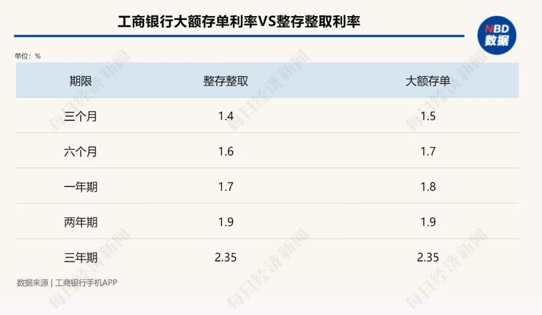 除了普通存款外,一般來講,大額存單起存起點高、利率也較普通定期更具優勢。但經歷本次降息後,大額存單利率也與普通定期趨同。每經記者從工商銀行APP上查詢看到,該行大額存單20萬元起存,一年期、兩年期、三年期利率分別為1.8%、1.9%、2.35%,與各期限普通整存整取的最高利率相比較,一年及以下大額存單利率較普通定存高0.1個百分點。