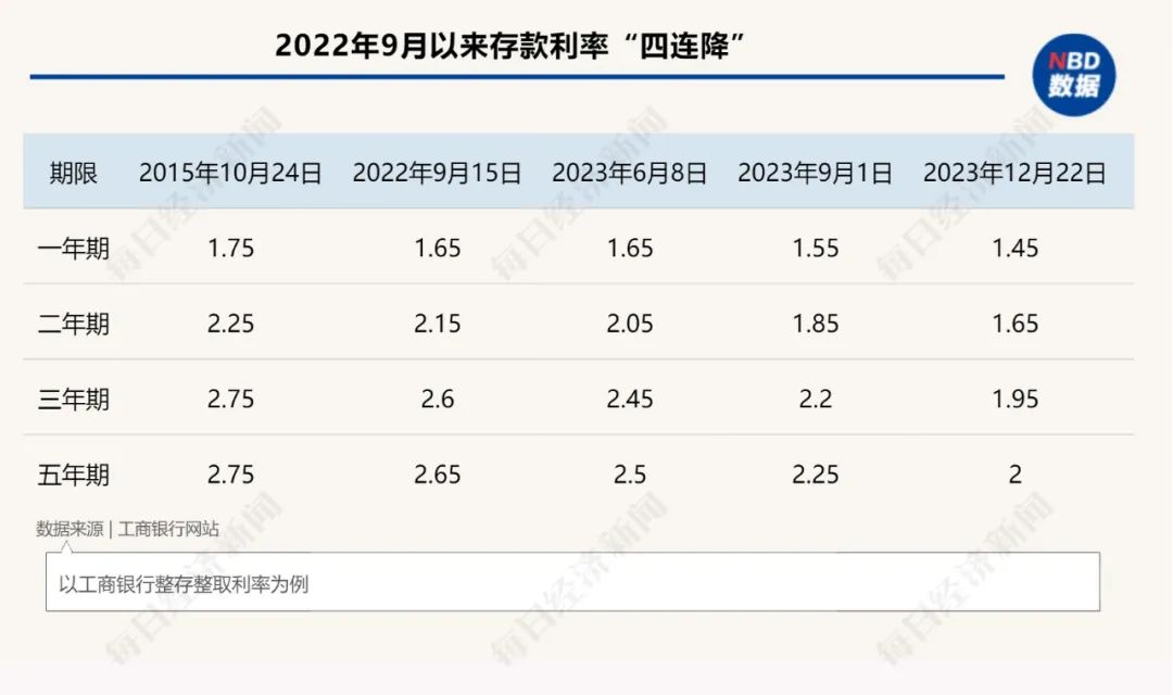 以工商銀行為例,2022年9月前,該行一年期、二年期、三年期和五年期整存整取掛牌利率分別為1.75%、2.25%、2.75%和2.75%。經過四次下調後,分別為1.45%、1.65%、1.95%和2.0%。