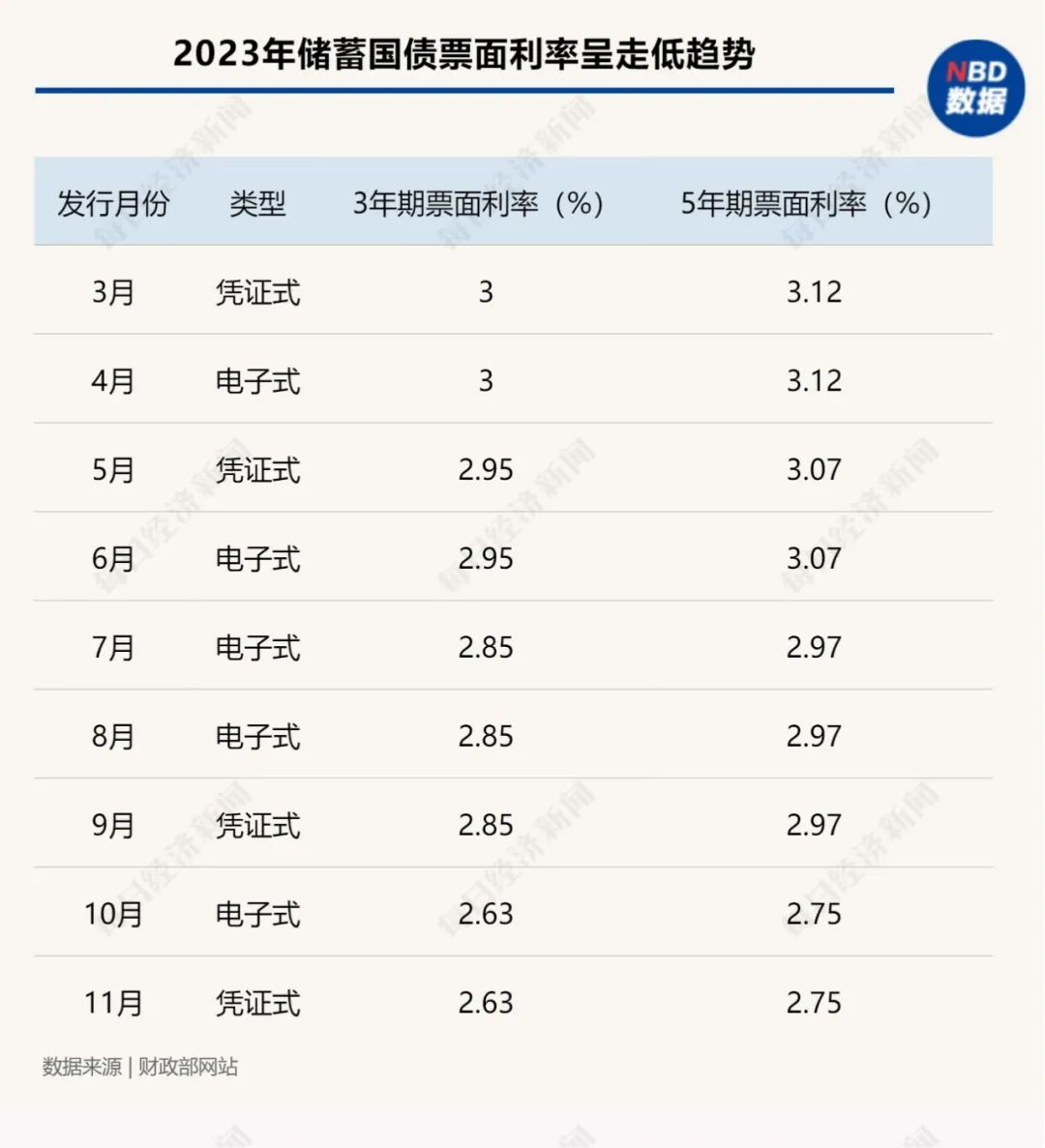 以剛過去的2023年為例,記者注意到,去年儲蓄國債也經歷了數次“降息”。3月發行的儲蓄國債(憑證式)利率由前期的3年期3.05%、5年期3.22%,調整為3年期3%、5年期3.12%;5月發行的儲蓄國債(憑證式),3年期和5年期利率再度下調5個基點,分別為2.95%和3.07%,這也是近年來儲蓄國債票面利率首次降至3%以下;7月發行的3年期和5年期儲蓄國債(電子式)利率分別降至2.85%、2.97%;10月發行的儲蓄國債(電子式),3年期利率降至2.63%,5年期利率降至2.75%。