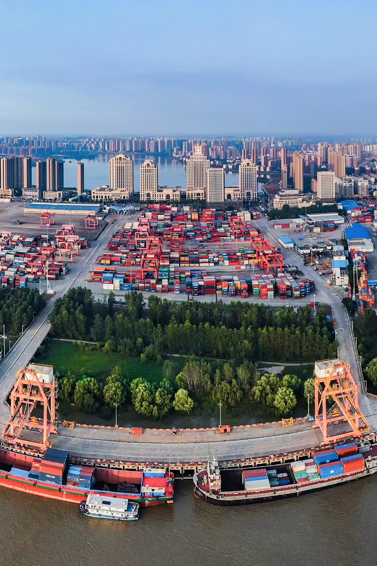奔騰不息的長江岸邊,紅色的龍門吊高聳,各種顏色的集裝箱堆疊,集卡有序地穿梭其中。武漢陽邏港碼頭目前已開闢多式聯運通道42條,輻射區域延伸到西北、西南內陸地區及歐洲腹地,實現“通江達海”。