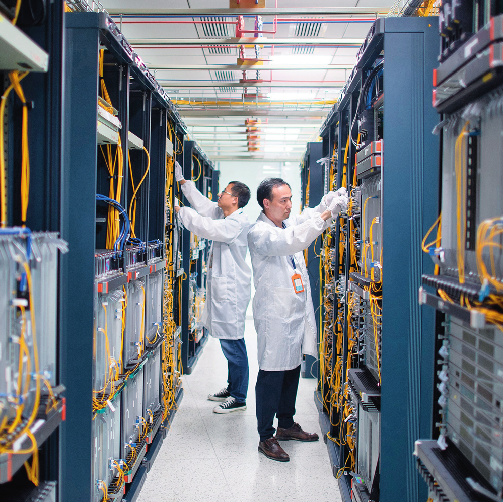 ▲武漢光迅科技股份有限公司生產車間內,技術人員在光模塊生產線作業