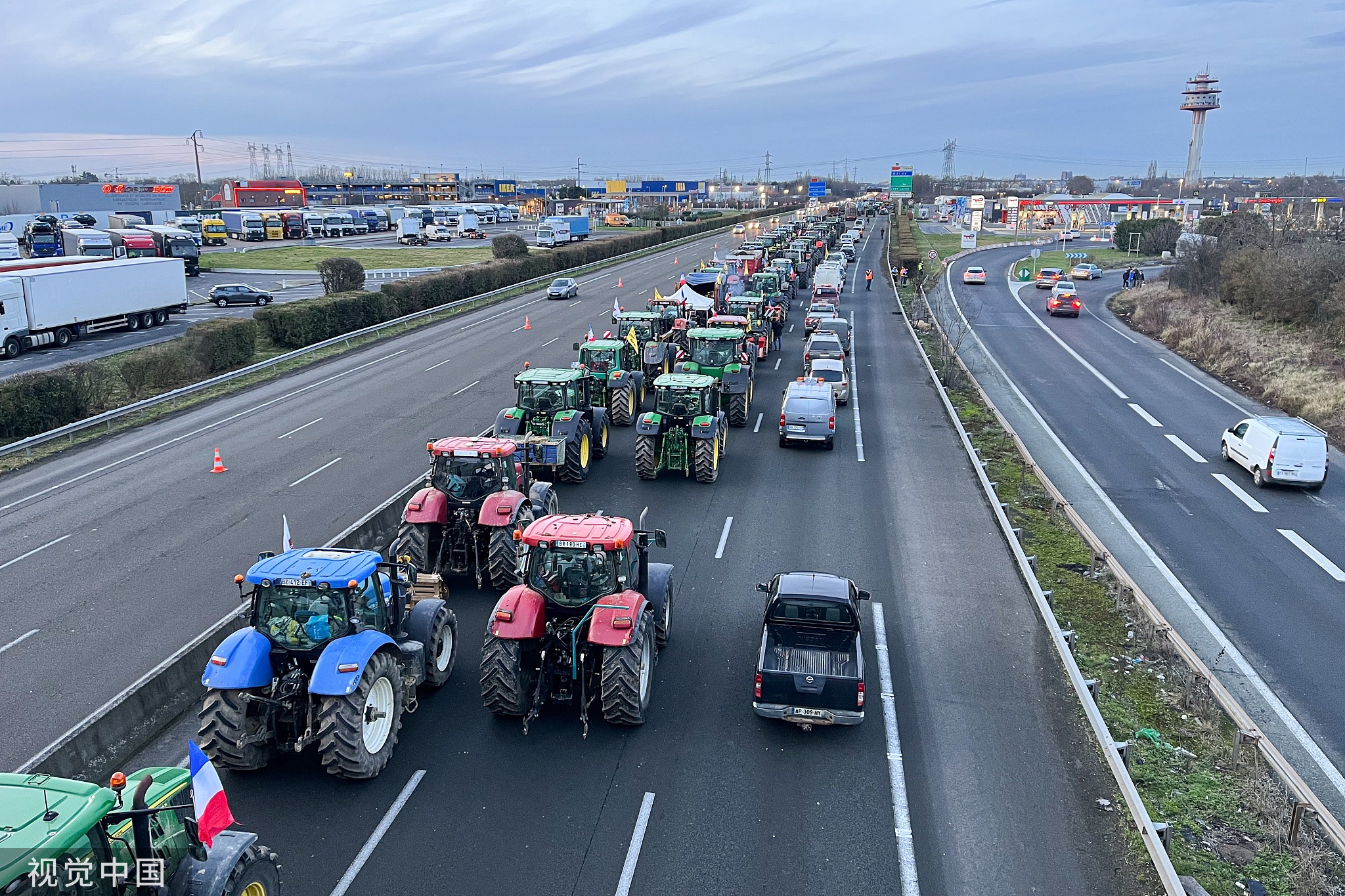 1月29日,法國法蘭西島大區,抗議農民封鎖通往巴黎的A6高速公路 圖源:視覺中國