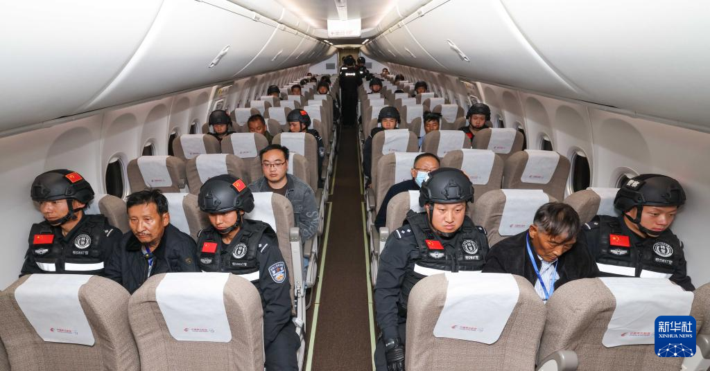 1月30日,白所成、白應蒼、魏懷仁、劉正祥、劉正茂、徐老發等10名緬北重大犯罪嫌疑人在被押解回國的飛機上。新華社記者 殷剛 攝
