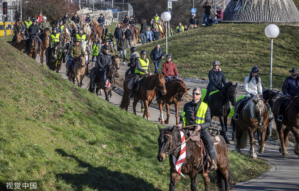 當地時間1月28日,德國巴登-符騰堡州農民騎馬參加遊行 抗議政府減少對柴油補貼 圖自視覺中國