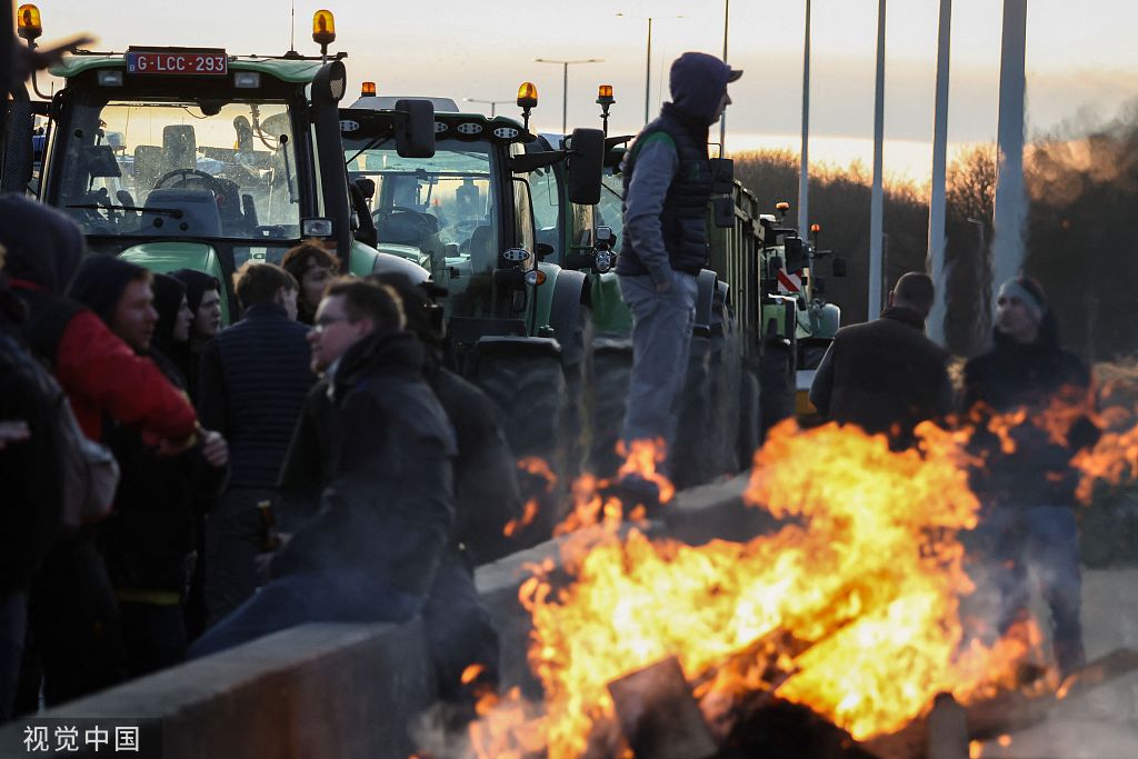 當地時間1月28日,比利時農民在那慕爾省E42高速公路舉行抗議活動 圖自視覺中國