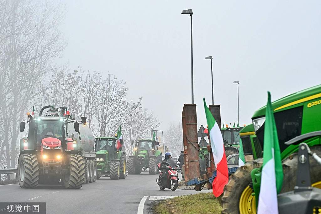 當地時間1月30日,意大利農民在梅利格納諾高速公路入口附近舉行抗議活動 圖自視覺中國