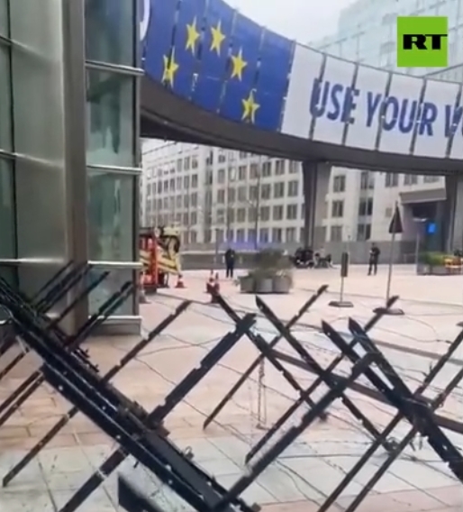 另據俄媒“今日俄羅斯”(RT)31日報道,近日社交媒體上熱傳的一則視頻顯示,布魯塞爾歐洲議會大廈前的廣場上設置了阻礙抗議農民拖拉機車隊通行的路障。