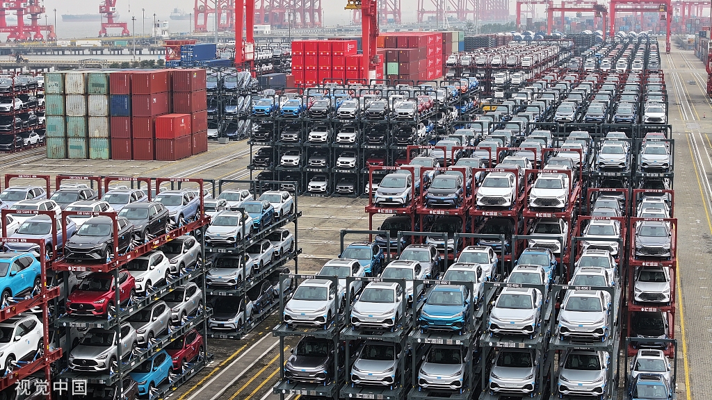 2023年12月13日,蘇州港太倉港區國際集裝箱碼頭,即將出口的新能源汽車 圖自視覺中國