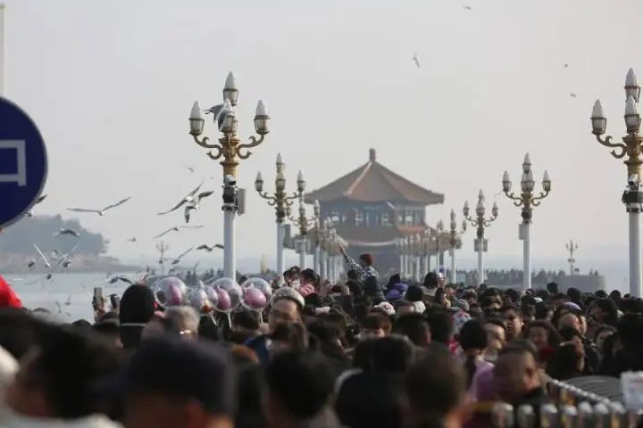 2月10日大年初一,青島知名景點棧橋,人擠得是裏三層外三層,有網友戲稱:“去年的今天我還有站在棧橋上被人踩掉鞋的權利,今年只能站在老遠乾瞪眼了。”