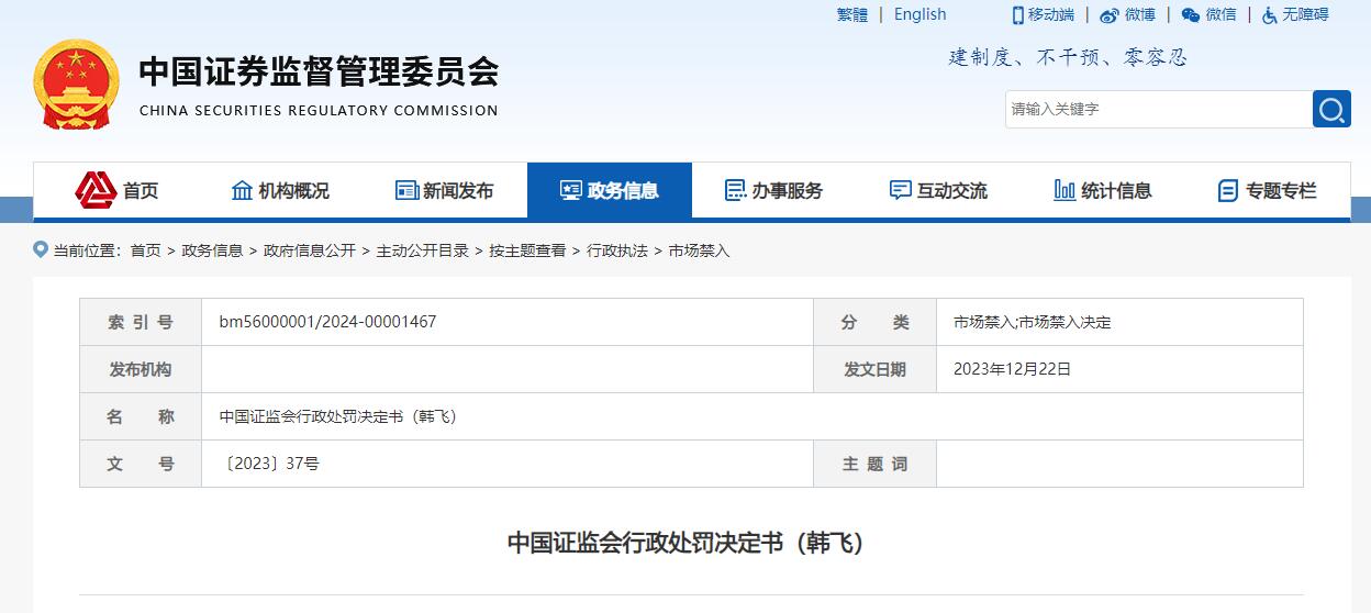 中國證監會行政處罰決定書(韓飛)