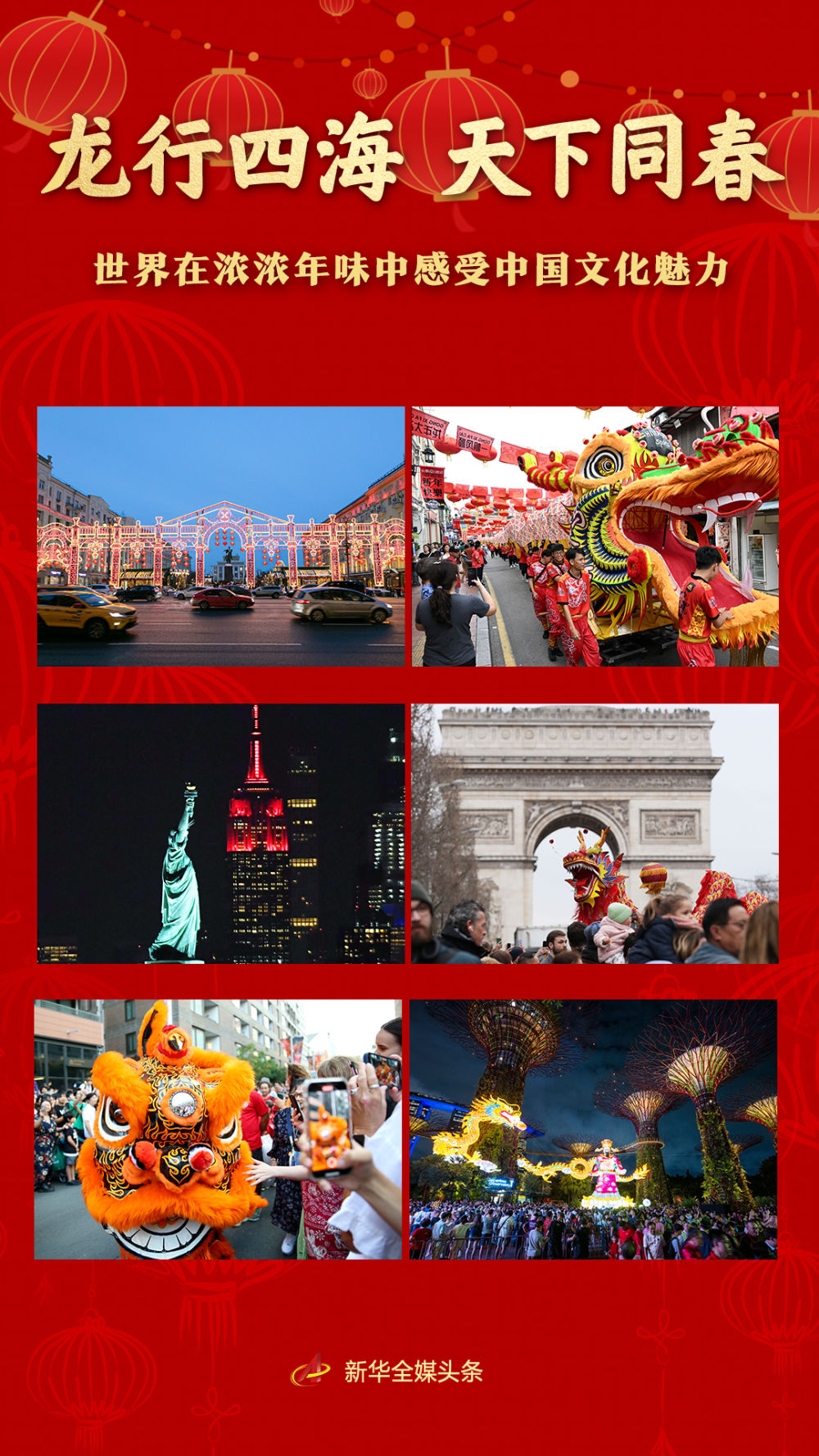從各國使節在聯合國體驗包餃子、寫福字,到瑞士日內瓦萬國宮高懸起大紅燈籠,從新加坡“春到河畔”的巨龍燈飾熠熠生輝,到馬來西亞馬六甲的百餘少年共舞長龍……天下同春,龍年的祝福正從四面八方傳來。