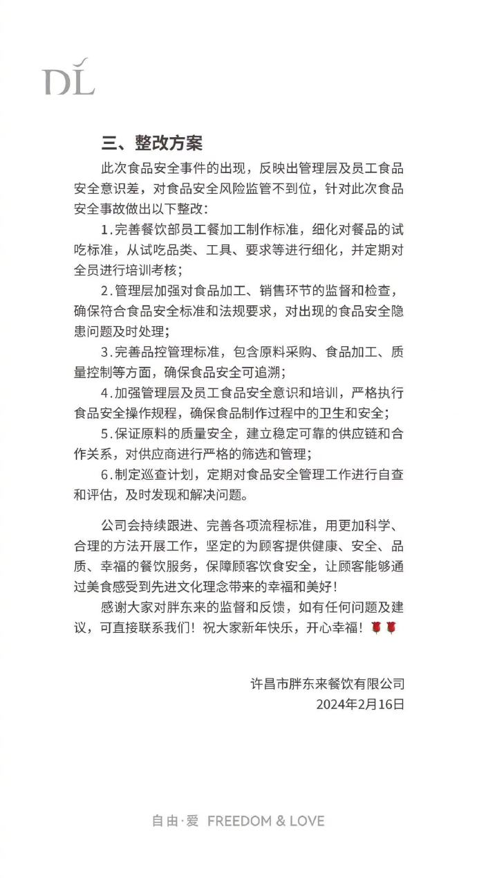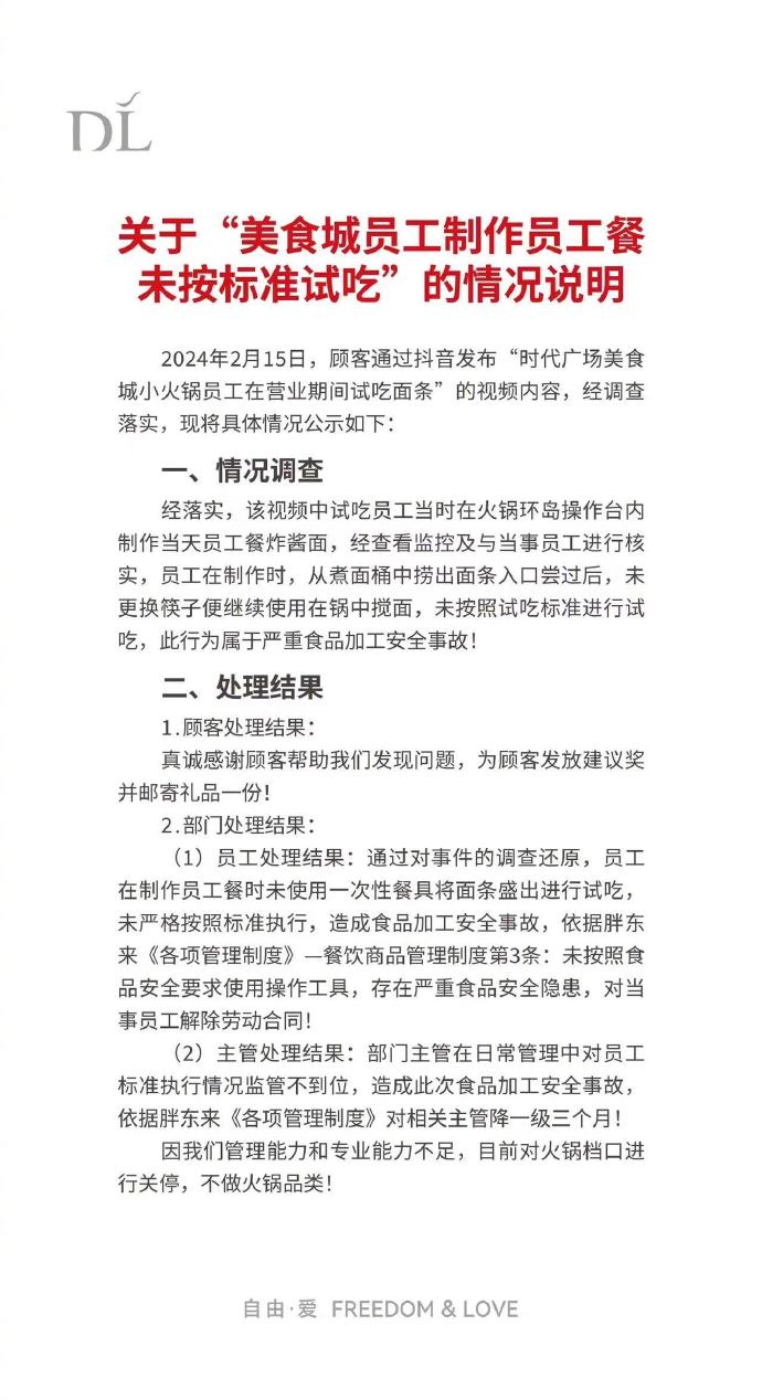 2月16日,胖東來在社交平台發佈況説明稱:經落實,網傳視頻中試吃員工當時在火鍋環島操作枱內製作當天員工餐炸醬麪,經查看監控及與當事員工進行核實,員工在製作時,從煮麪桶中撈出麪條入口嘗過後,未更換筷子便繼續使用在鍋中攪面,未按照試吃標準進行試吃,此行為屬於嚴重食品加工安全事故,對當事員工解除勞動合同,並對火鍋檔口進行關停,不再做火鍋品類。