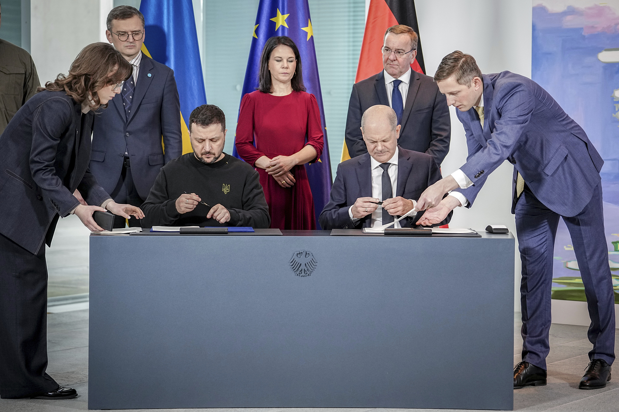 當地時間2月16日,澤連斯基與朔爾茨在柏林簽署安全協議 圖源:視覺中國