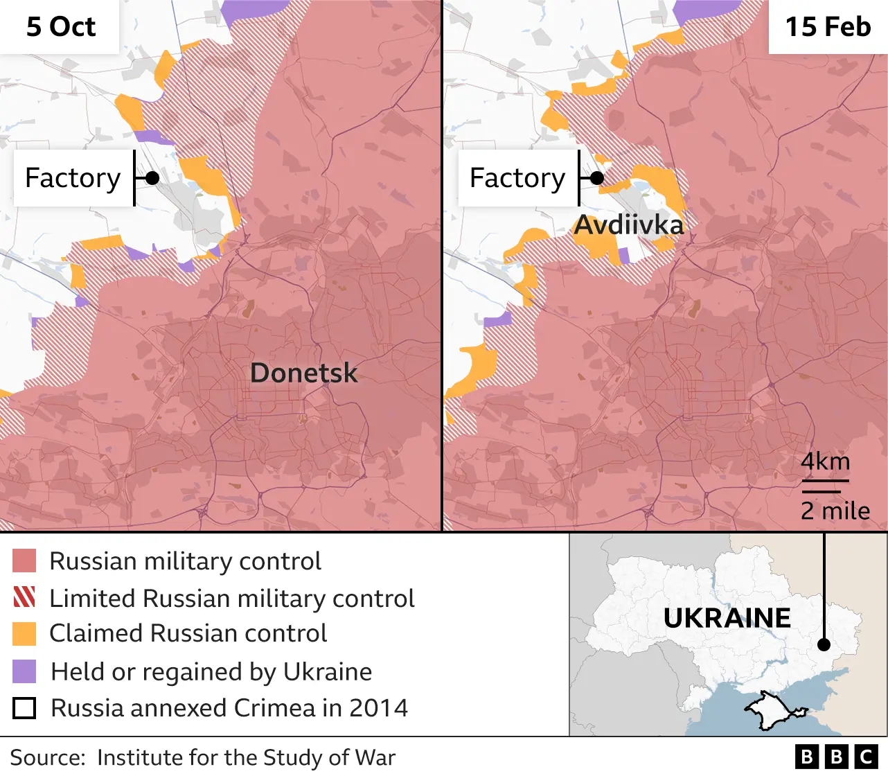 俄烏衝突前線對比圖(去年10月5日和今年2月15日) 圖片來源:BBC