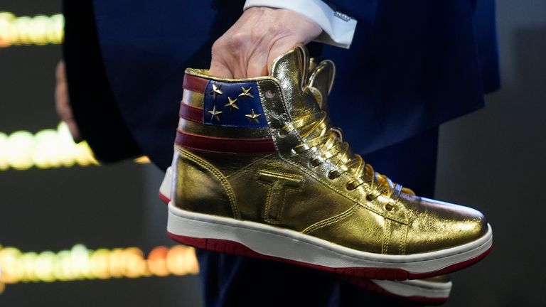 在費城會議中心,他向觀眾們展示了一款金光閃閃的高幫球鞋,靠近鞋口處印有美國國旗的圖案,側面還有代表着品牌的字母“T”標識。當特朗普表示這是他推出的首款官方球鞋時,現場爆發出巨大的歡呼聲。