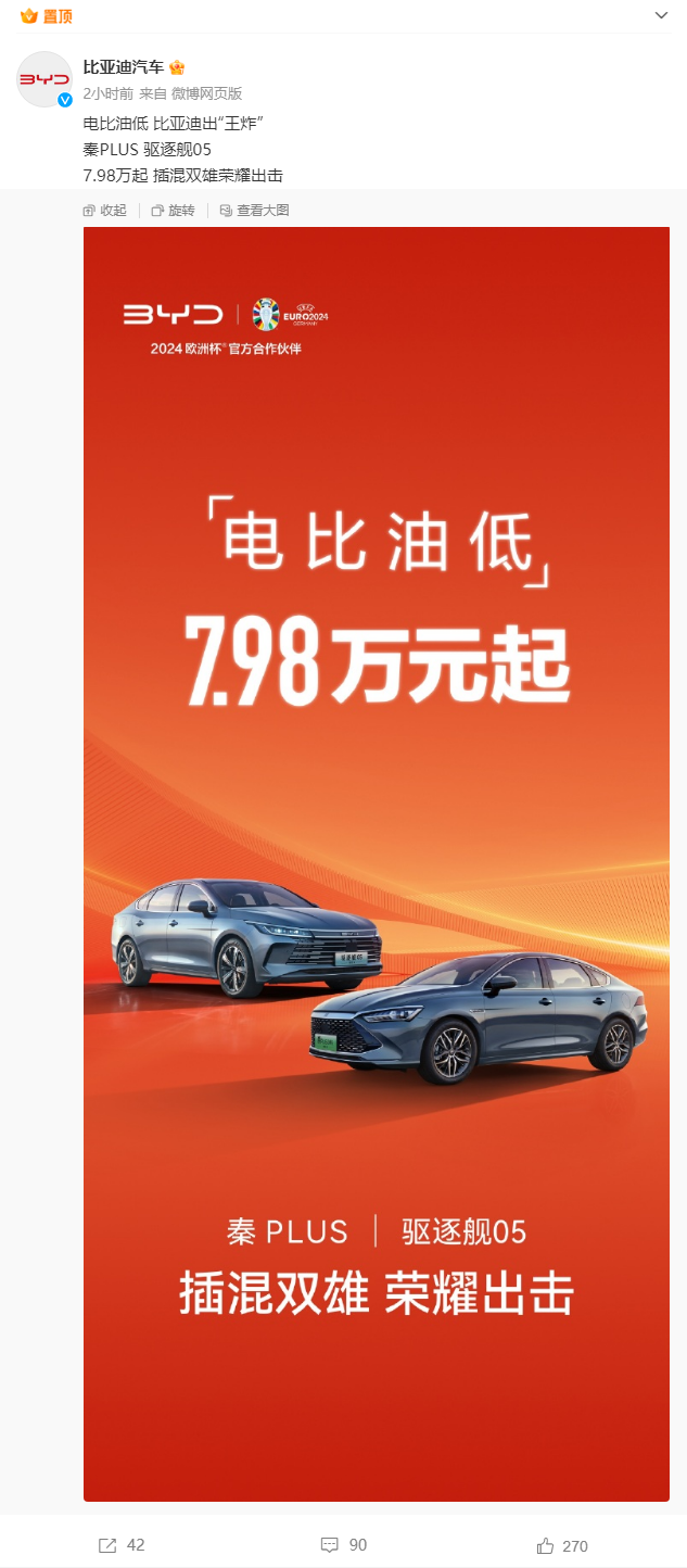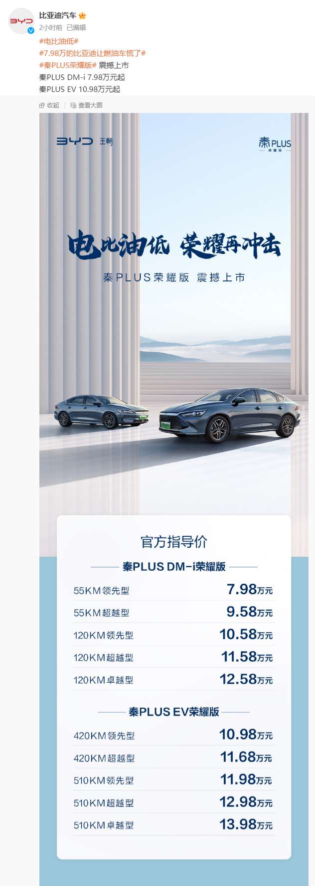比亞迪汽車官博發文表示,電比油低,比亞迪出“王炸”,秦PLUS驅逐艦05,7.98萬起插混雙雄榮耀出擊。
