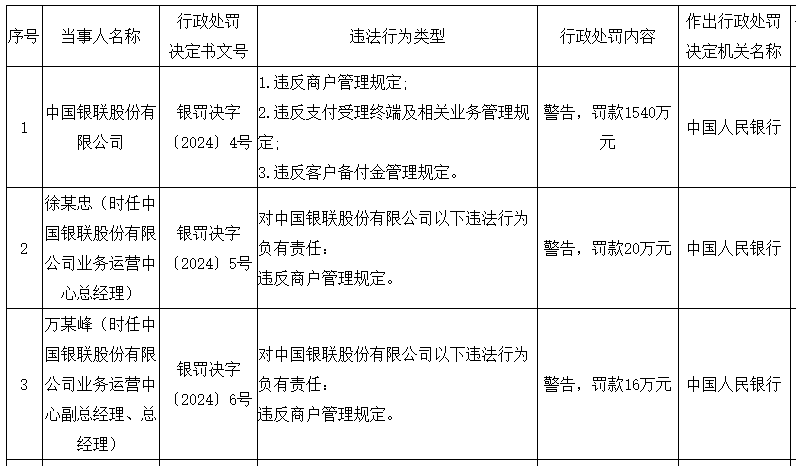 並且,中國銀聯7個有關方也被中國人民銀行罰款,比如時任中國銀聯股份有限公司業務部分管負責人李某被罰50萬元;時任中國銀聯股份有限公司業務部總經理魯某軍被罰款50萬元。李某和魯某軍被罰款的原因均為對中國銀聯違反支付受理終端及相關業務管理規定負有責任。