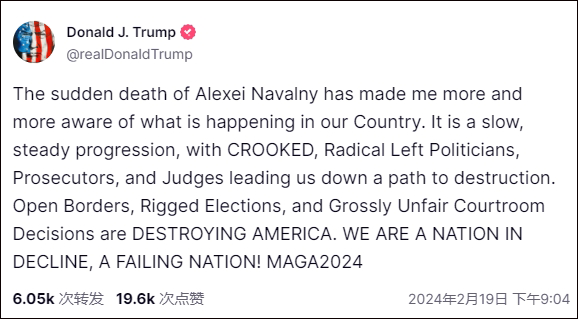 “阿列克謝·納瓦利內的突然去世,讓我越來越意識到我們國家正在發生的事情,”特朗普在自創社交媒體平台“真相社交”發文稱,“這是一個緩慢而穩定的過程,狡猾、激進的左翼政客、檢察官和法官將我們引向毀滅之路。開放的邊界、被操縱的選舉和極不公平的法庭判決正在摧毀美國”。
