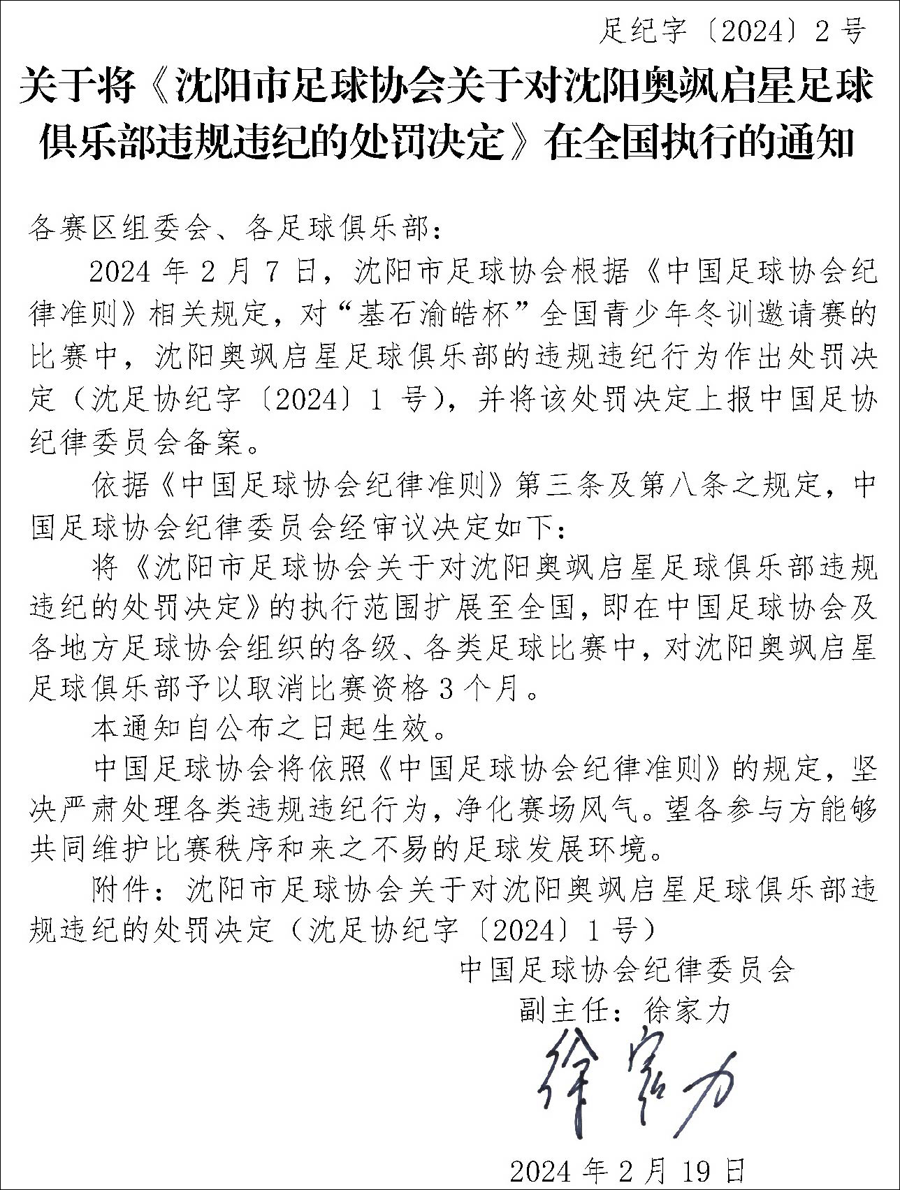 據中國足球協會網站21日消息,中國足球協會發布通知,將《瀋陽市足球協會關於對瀋陽奧颯啓星足球俱樂部違規違紀的處罰決定》及《遼寧省足球運動協會關於對教練員吳高俊違規違紀的處罰決定》在全國執行,即在中國足球協會及各地方足球協會組織的各級、各類足球比賽中,對瀋陽奧颯啓星足球俱樂部予以取消比賽資格3個月,禁止吳高俊進入比賽替補席12個月。