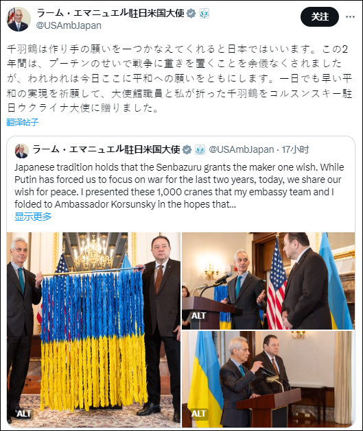 此外,伊曼紐爾在社交平台上發文稱,根據日本的傳統,千紙鶴能夠實現折它的人的一個願望。“為了祈求和平早日實現,我和使館工作人員折了一千隻千紙鶴,贈送給烏克蘭駐日本大使科森斯基”。