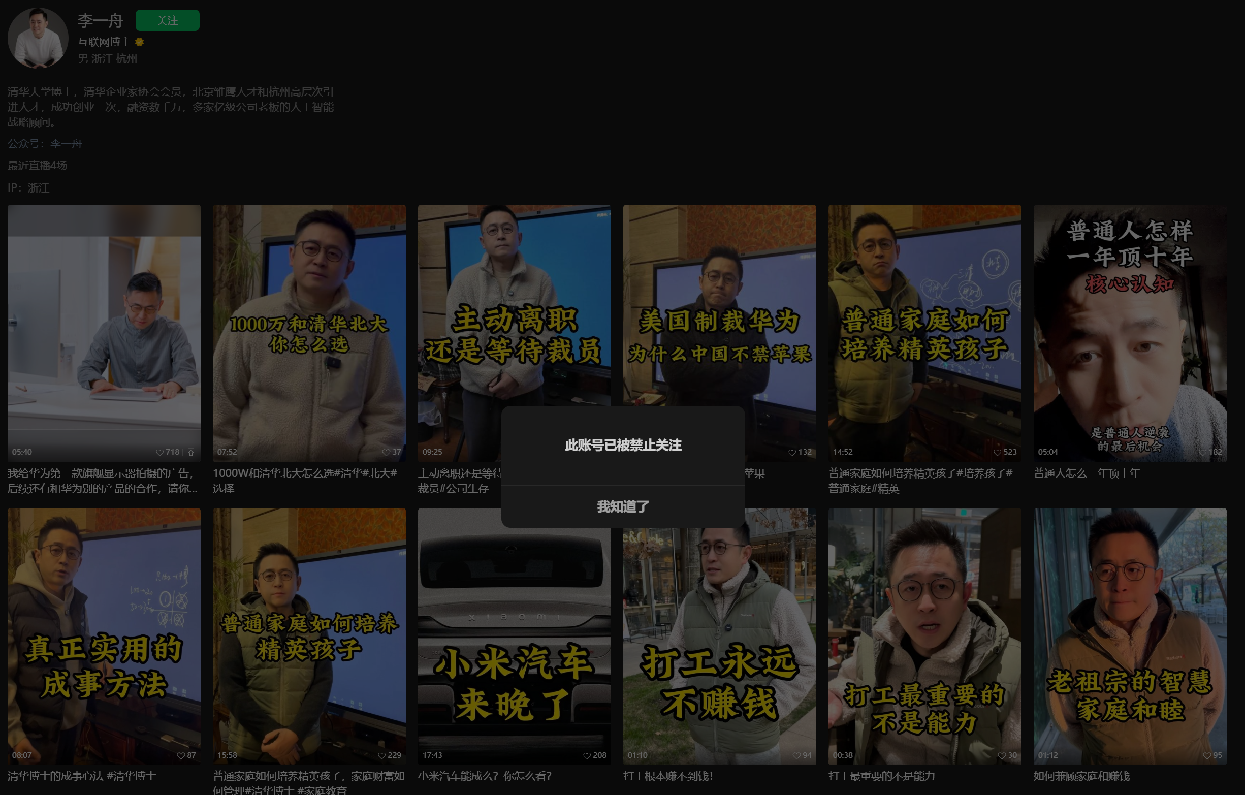 李一舟的個人視頻號現已被禁止關注。不過,其官方視頻號“李一舟AI”仍然可以關注。