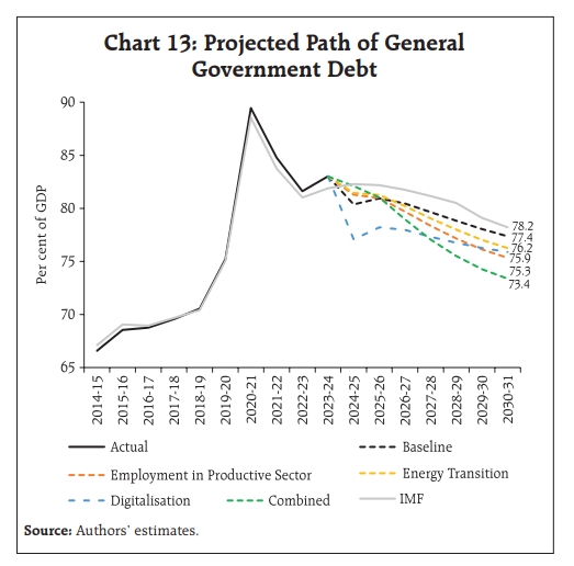 印度央行(印度儲備銀行)官員預測,根據綜合評估,到2030-2031財年,印度政府負債率會降至73.4%,低於IMF預測的78.2%(圖片摘自論文)