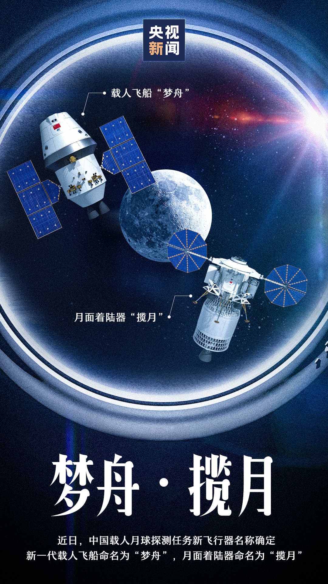 新飛行器的名稱具有鮮明的中國特色、時代特色和文化特色。“夢舟”寓意載人月球探測承載中國人的航天夢,開啓探索太空的新徵程,也體現了與神舟、天舟飛船家族的體系傳承;新一代載人飛船包括登月版和後續執行空間站任務的近地版兩個型號,其中,登月版採用“夢舟Y”(飛船名稱+“月”字音節的大寫首字母)。“攬月”取自毛主席詩詞“可上九天攬月”,彰顯中國人探索宇宙、登陸月球的豪邁與自信。此前,新一代載人運載火箭已被命名為“長征十號”。
