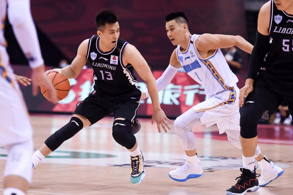 2020年6月20日,遼寧隊球員郭艾倫在比賽中帶球突破首鋼隊球員林書豪的防守。新華社記者 李紫恆 攝