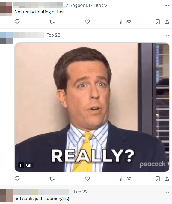 也有網友“肯定”BBC的判斷:“確實沒沉,只是‘正在下潛’(submerging)”。“好像也不會一直浮着”,“只是在喝水罷了”。