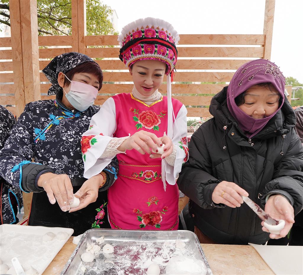 除了看舞龍舞獅表演,市民們也能一飽口福。三林人早在元明時期,就已形成了本幫餐飲文化的習慣,號稱“廚藝之鄉”。老街上既有聞名遐邇的龍獅會館,還有“扣三絲”上過央視《舌尖上的中國》的“三林本幫館”。在民俗參與區,三林的賢姑巧姨現場包制湯圓,現包現烹現嘗。她們包的湯圓,有菜肉、豆沙和芝麻三種,又大又圓,既有節日儀式感,又有團團圓圓的幸福感。塌餅是上海本地傳統點心,在上海郊區盛行。三林塌餅看起來“圓圓塌塌”,滬語諧音“太平”。“我們過年過節做塌餅,圖的是‘和和美美、太太平平’。”