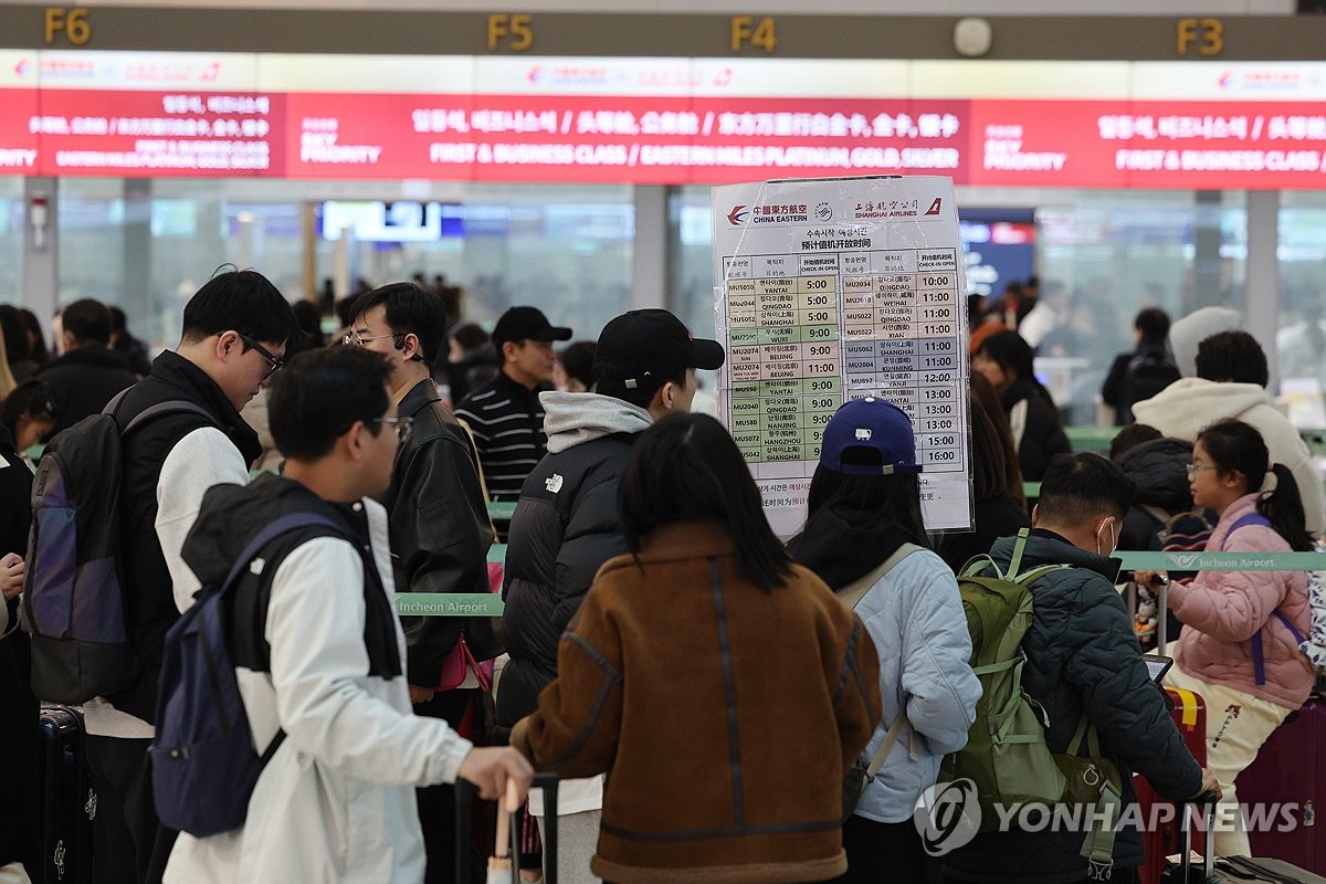 資料圖:2月18日,在仁川國際機場,旅客等待辦理赴華登機手續。(圖源:韓聯社)