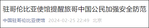 據微信公眾號“中國駐哥倫比亞使館”2月25日消息,近來,哥倫比亞部分地區惡性治安案件時有發生,首都波哥大市區發生數起槍擊和搶劫案,造成人員傷亡。中國駐哥倫比亞使館提醒中國公民和機構加強安全防範,儘量結伴出行,避免前往安全條件不佳、偏遠地區,勿隨身攜帶大量現金和貴重物品,關注住所和辦公場所安全。駕車出行時,下車後務必鎖好車輛,不在車內存放任何財物。