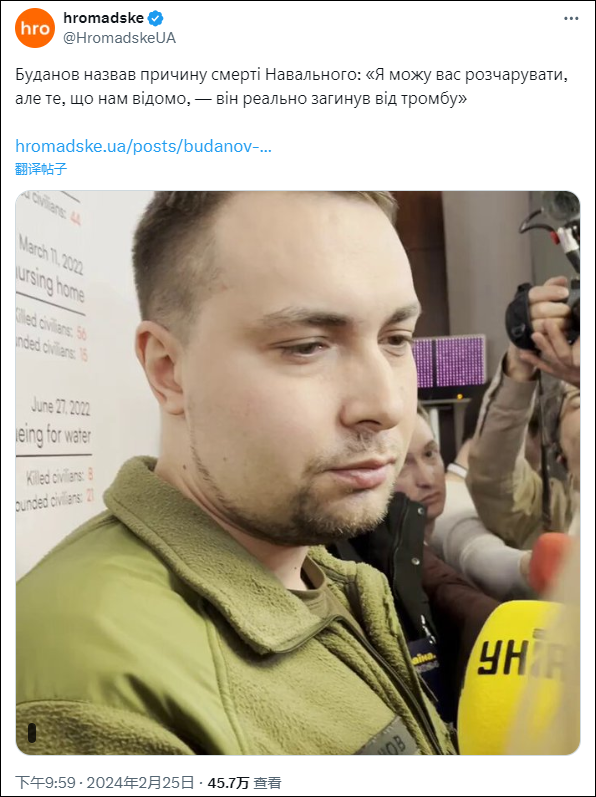 據《烏克蘭真理報》、Hromadske電視台等烏克蘭媒體當地時間2月25日報道,烏克蘭國防部情報總局局長基裏洛·布達諾夫(Kyrylo Budanov)當天表示,烏方得知的情況是,納瓦利內是因血栓而自然死亡的,並強調這一結果不是從互聯網上獲取的,暗示了準確度極高,“可能會讓一些人感到失望”。