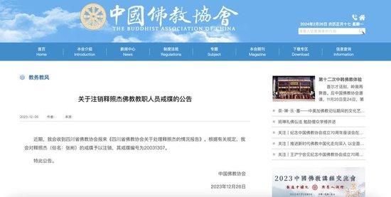 據媒體報道,中國佛教協會官網2023年12月26日發佈《關於註銷釋照傑佛教教職人員戒牒的公告》稱,“近期,我會收到四川省佛教協會報來《四川省佛教協會關於處理釋照傑的情況報告》。根據有關規定,我會對釋照傑(俗名:張彬)的戒牒予以註銷,其戒牒編號為20031307。”