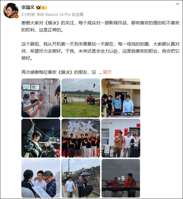 2月28日,張頌文發文感謝大家對《獵冰》的關注。他表示,每個觀眾對一部影視作品,都有喜歡的理由和不喜歡的權利,這是正常的。