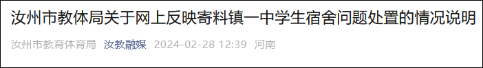 據河南省汝州市教育體育局微信公眾號“汝教融媒”2月28日消息,汝州市教體局發佈關於網上反映寄料鎮一中學生宿舍問題處置的情況説明。