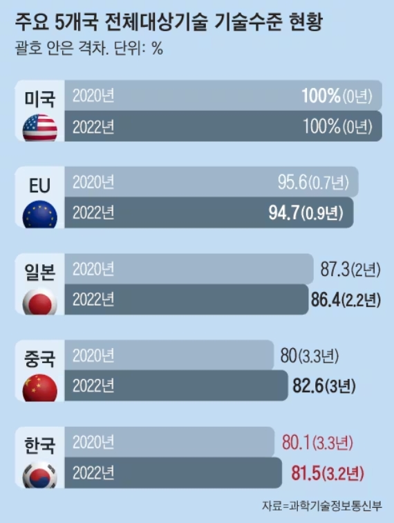韓國科技部評估認為,若將美國的發展水平視為100%,接下來依次為歐盟(94.7%),日本(86.4%)、中國(82.6%)和韓國(81.5%)。這是2012年以來,中國首次在韓政府發佈的科技水平榜單中領先韓國。
