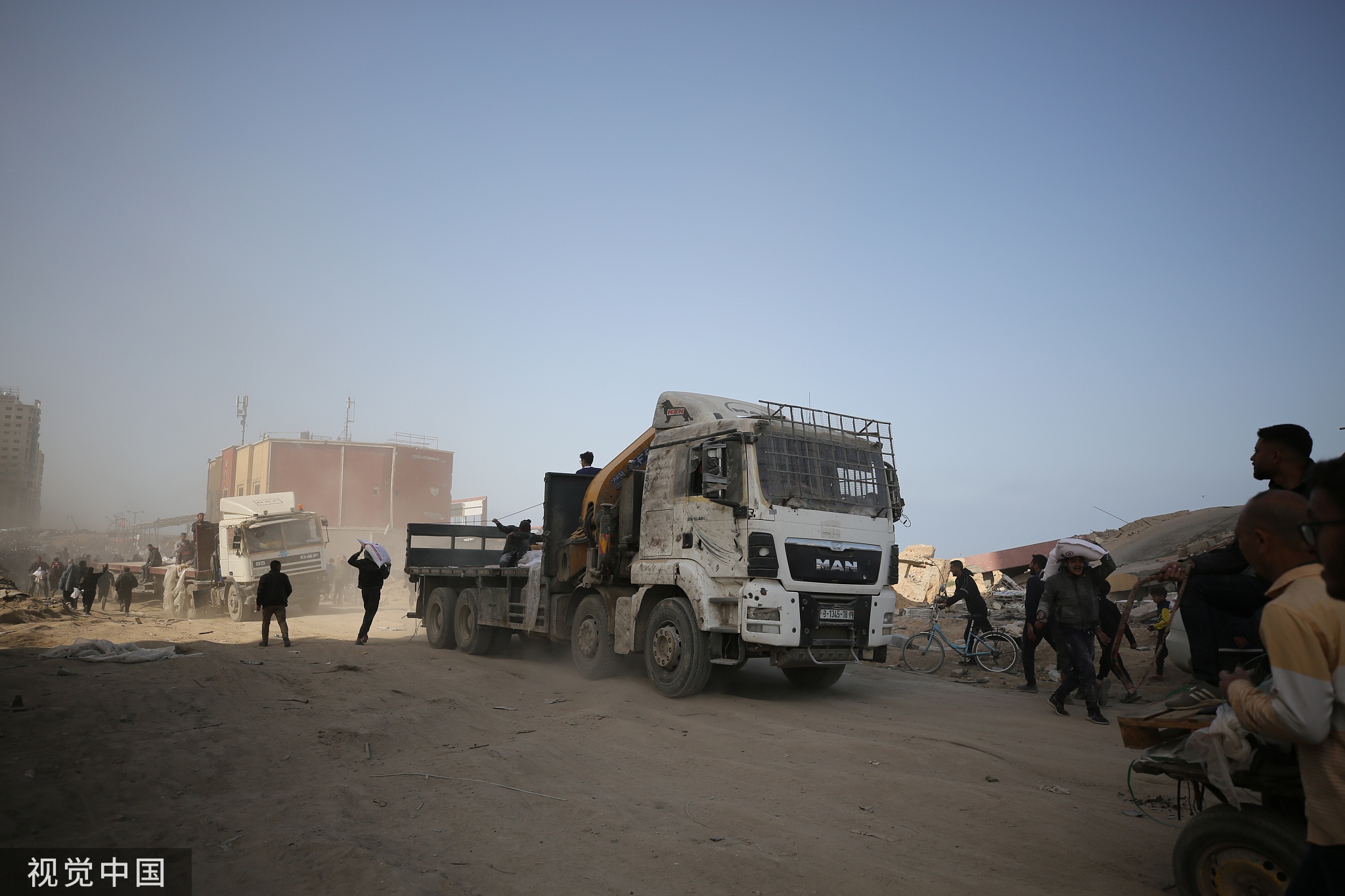 當地時間3月6日,加沙城,巴勒斯坦人從一輛援助卡車上領取麪粉 圖源:視覺中國