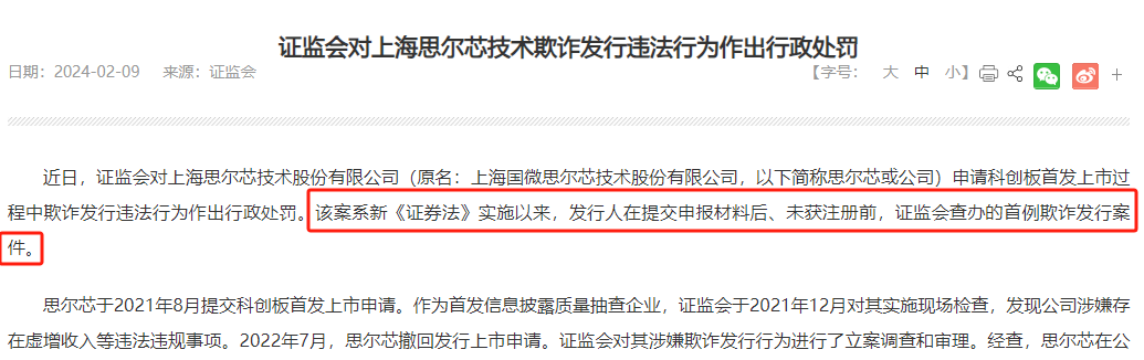 上交所方面,科創板IPO企業思爾芯雖然早於2022年7月終止。但今年2月9日,證監會通報了對思爾芯欺詐發行違法行為作出行政處罰的情況。思爾芯被處以400萬元罰款,時任高管被處以100萬-300萬元不等的罰款。該案系新《證券法》實施以來,發行人在提交申報材料後、未獲註冊前,證監會查辦的首例欺詐發行案件。