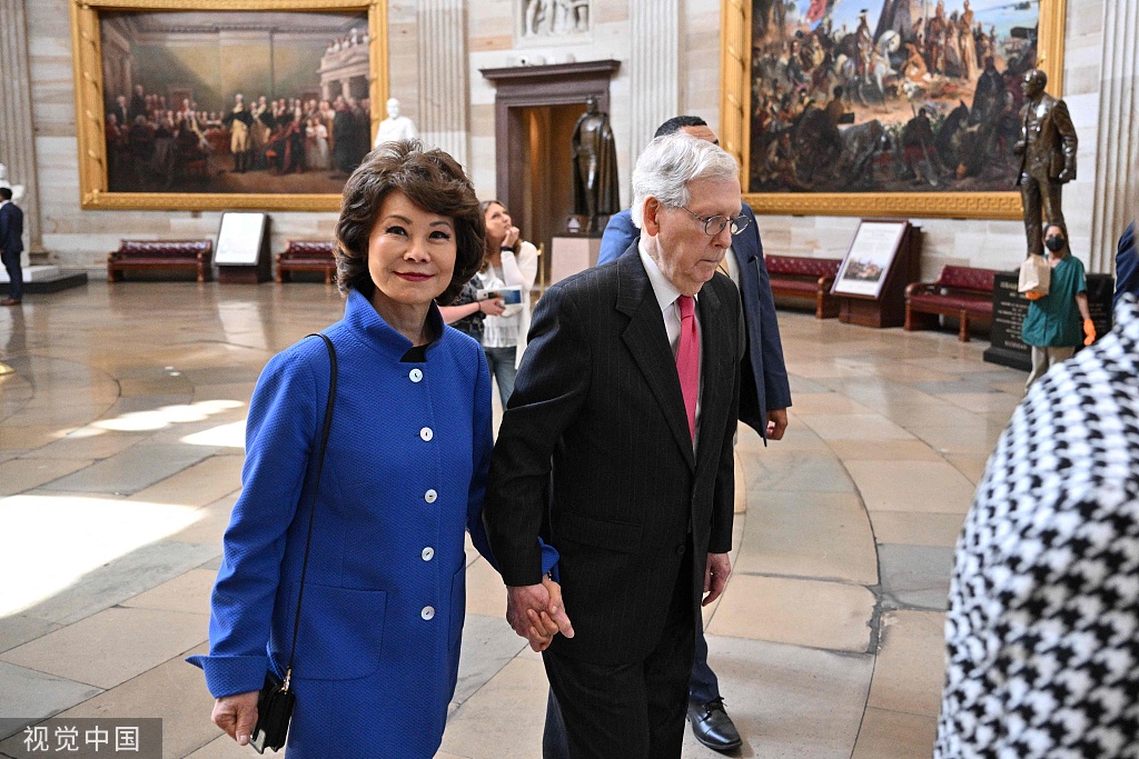 當地時間2023年5月17日,美國華盛頓,參議院少數黨領袖米奇·麥康奈爾和他的妻子趙小蘭走過華盛頓國會大廈的圓形大廳。(圖源:視覺中國)