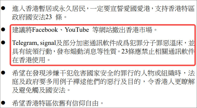 觀察者網查閲發現,文件中列有以下公眾意見:“建議將Facebook、YouTube等網站撤出香港市場”,“Telegram、Signal及部分加密通信軟件成為犯罪分子罪惡温牀,並具有統領行動,發佈煽動消息等性質。23條應禁止相關通信軟件在香港使用。”